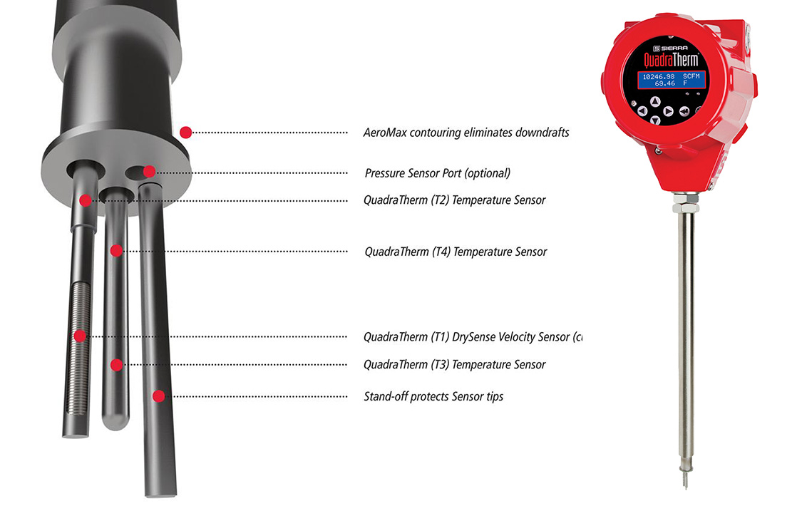 Multivariable mass flow is achieved when a temperature sensor is immersed in the flow stream to measure the temperature of the fluid, while a pressure sensing port leads to a pressure transducer.